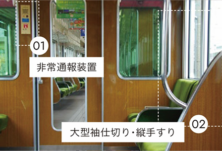 阪急電鉄では、車内で急病人や非常事態が発生した場合に、お客様から乗務員に通報できるよう、全車両に非常通報装置を設置しています。また、万が一の急ブレーキ時に、お客様の転倒や衝突を防止するため、1000系及び1300系以降の車両では座席端部の袖仕切りを大型に改良するとともに、縦手すりを設置しています。最も新しい形式の車両である2000系及び2300系においては、車いすスペースの拡大を図っており、車いす固定具を設置したり、車いすスペース・優先座席付近の吊り手の高さ、色を変更したりするなど、安全性向上に取り組んでいます。阪神電気鉄道では、乗務員と通話が可能な非常通報装置、車内案内表示器、車両連結間の転落を防止するほろを全車両に設置しています。また、普通車両の5700系及び5500系は、吊革の高さを3段階とすることや縦手すりを増やすことで、車両の揺れに対してお客様が適切に体を保持できるようにし、安全性向上に取り組んでいます。