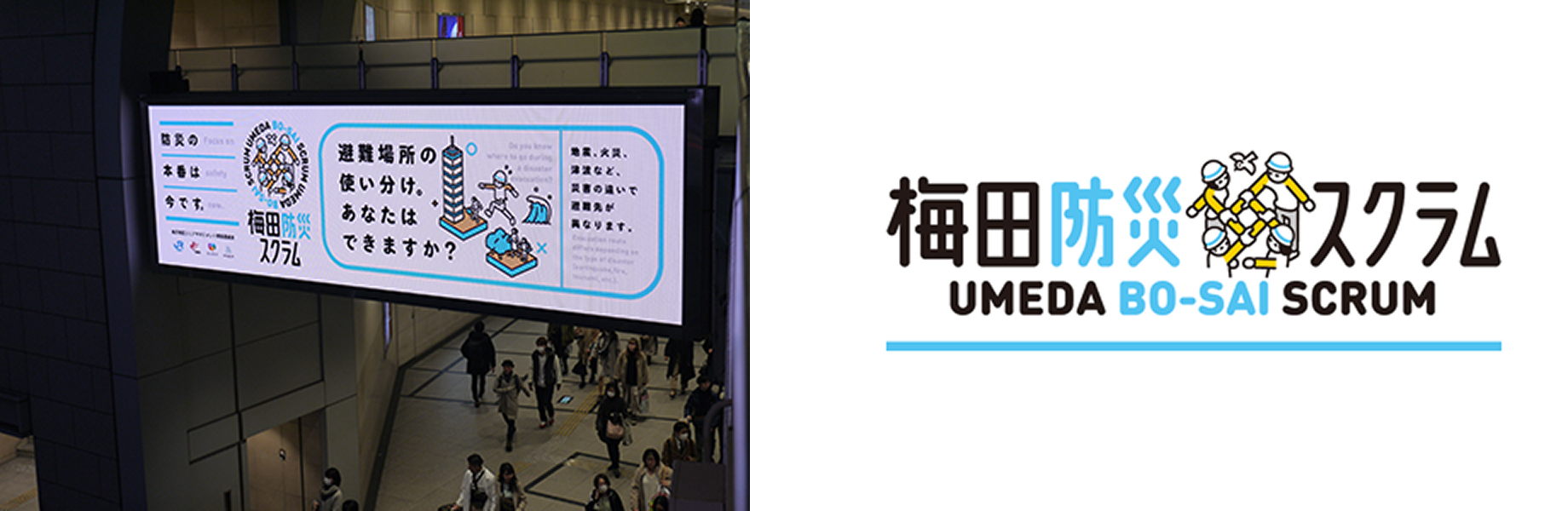 西日本旅客鉄道・グランフロント大阪TMO・Osaka Metroとともに、梅田エリアに来訪されるお客様やテナント従業員の方々などを対象とした防災啓発活動「梅田防災スクラム」を展開し、非常時の対応力向上(※)にまちぐるみで取り組んでいます。