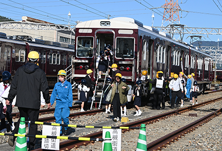 阪急電鉄では、2024年11月、宝塚線平井車庫において、南海トラフ地震の発生に備える訓練を実施しました。列車が駅間の津波浸水予想区域で停止する事態を想定し、お客様を付近の踏切道まで避難誘導する訓練を行った際は、車いすご利用の方や近隣の小学生にも参加していただき、避難の方法を検証しました。また、地震により傾斜した架線柱や大きく変位した軌道の復旧に関する技能習熟訓練を実施しました。